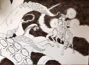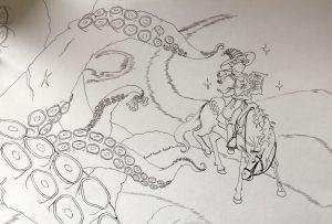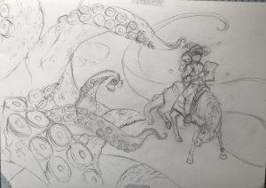 Het thema voor deze glossy is Erasmuscon. Op basis van die informatie moest ik een plan bedenken. Voor Erasmuscon zijn de prominentste figuren op de poster en flyers een tijdreiziger op zijn eenhoorn en een stel tentakels. Na verloop van de tijd kreeg de tijdreiziger een achtergrondverhaal. Na enig nadenken besloten we dat deze drie wel op de cover moesten, maar wat zou een interessante compositie zijn?