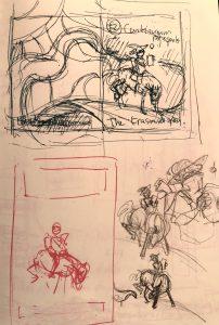 After the first rough sketch, I like to flesh the sketch out more. There are multiple ways to do this, but I like to draw some important parts a bit bigger. Especially characters. But, of course, an eye needs to be kept out for the whole cover, including the image, but also the title and other information.