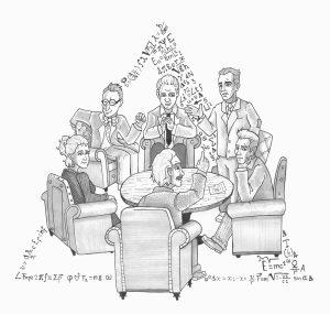 Schrödinger zit niet op zijn eigen plek maar op de brede armleuning van de stoel van Curie. Met een flamboyant armgebaar nodigt hij haar uit om plaats te nemen, iets wat ze onmogelijk kan doen zonder hem aan te raken. Ik weet dat Schrödinger in zijn leven onverzadigbaar was; hij heeft een stroom niet-erkende kinderen achtergelaten die meestal wel zijn hormoonhuishouding maar niet zijn intelligentie hebben geërfd. Hij heeft geen oog voor mij, hij kijkt alleen naar Curie.