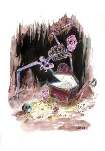 Het klepperen hield op. Tocht trok een zacht fluitend spoor door de donkere grot. De grote kaarsen die Skelet op aanwijzing van Schatkist kort daarvoor aangestoken had, waren bijna op. Ook de stapels dubloenen die hoog rond kist stonden opgestapeld, blonken zoals ze alleen konden blinken wanneer Skelet zich voldoende gewaardeerd voelde. Het wachtte even, draaide zich toen om en legde bijna liefdevol een knokige hand op het donkere, metalen beslag van Schatkist. Deze kraakte zachtjes.